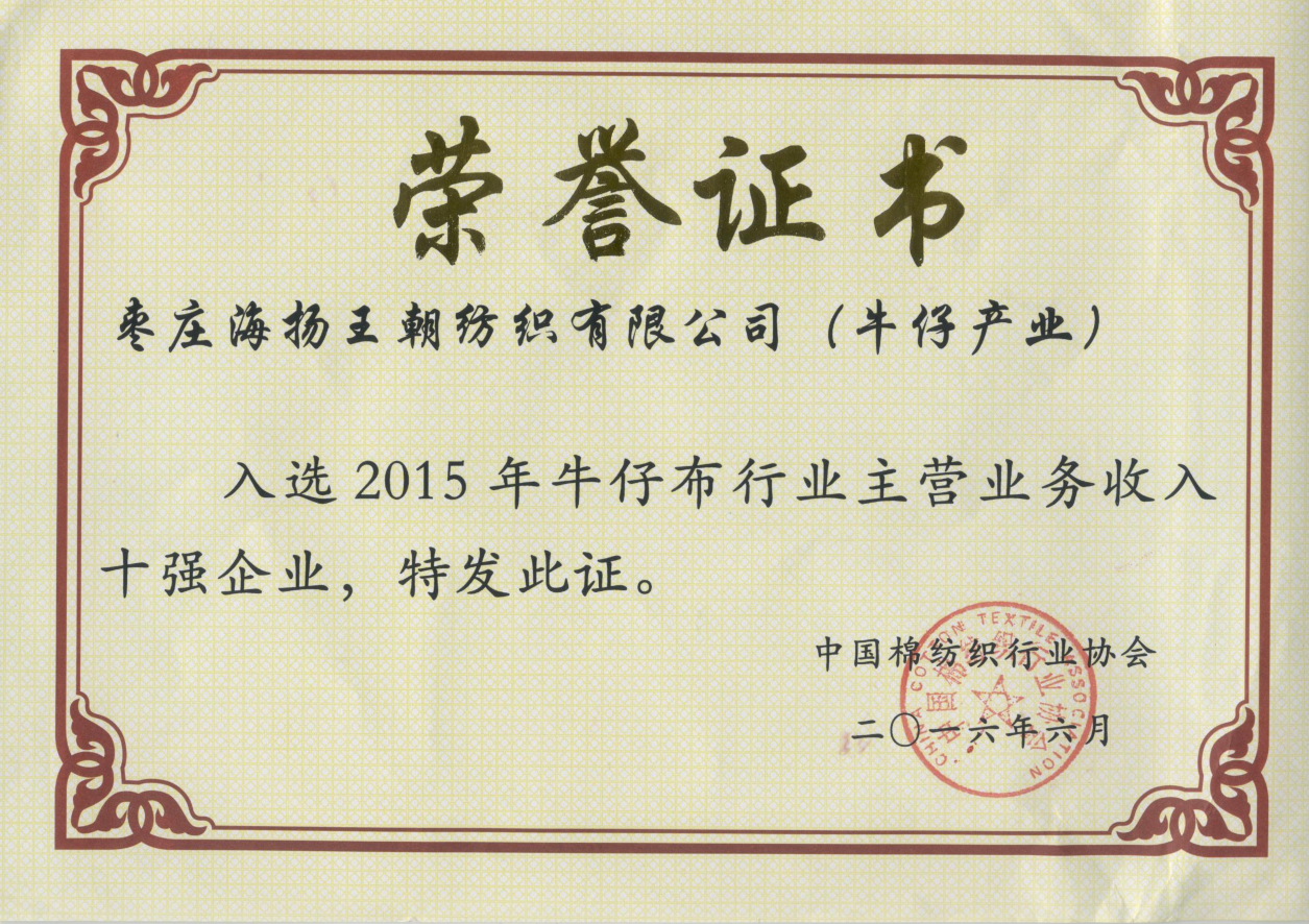 “2015年牛仔布行業(yè)主營業(yè)務(wù)收入十強(qiáng)企業(yè)”榮譽(yù)證書
