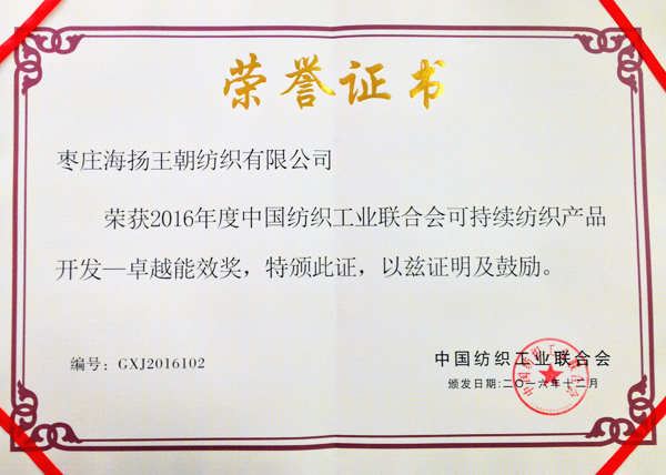 2016年12月12日中國紡織工業(yè)聯(lián)合會在北京召開了2016中國紡織創(chuàng)新年會,公司總經(jīng)理孫勇受邀參會。在此次大會,我公司被授予“2016年度中國紡織工業(yè)聯(lián)合會可持續(xù)紡織產(chǎn)品開發(fā)-卓越能效獎”榮譽(yù)證書,充分肯定了我公司多年來在能源利用和節(jié)能方面取得的成績,這也堅(jiān)定了公司走科技含量高、經(jīng)濟(jì)效益好、資源消耗低、環(huán)境污染少的新型工業(yè)化道路的決心,努力將海揚(yáng)王朝打造成國際知名的現(xiàn)代化紡織企業(yè)!